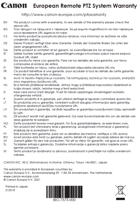 Οι απομακρυσμένες κάμερες ή ελεγκτές PTZ της Canon που προορίζονται για πώληση και αγοράζονται εντός του Ευρωπαϊκού Οικονομικού Χώρου ("ΕΟΧ" – Ευρωπαϊκή Ένωση, Ισλανδία, Λιχτενστάιν, Νορβηγία) και στην Ελβετία και το Ηνωμένο Βασίλειο ("Περιοχή"), καλύπτονται από την Ευρωπαϊκή εγγύηση για το απομακρυσμένο σύστημα PTZ της Canon. Η Canon εγγυάται ότι σε περίπτωση που η νέα απομακρυσμένη κάμερα ή ο ελεγκτής PTZ παρουσιάσει ελάττωμα εντός της περιόδου ισχύος της εγγύησης, το σφάλμα θα αποκαθίσταται χωρίς χρέωση (ισχύουν όροι και προϋποθέσεις – βλ. παρακάτω).